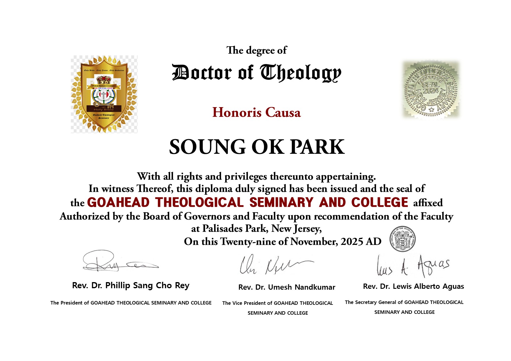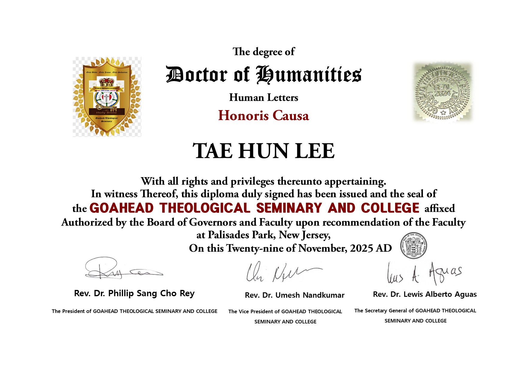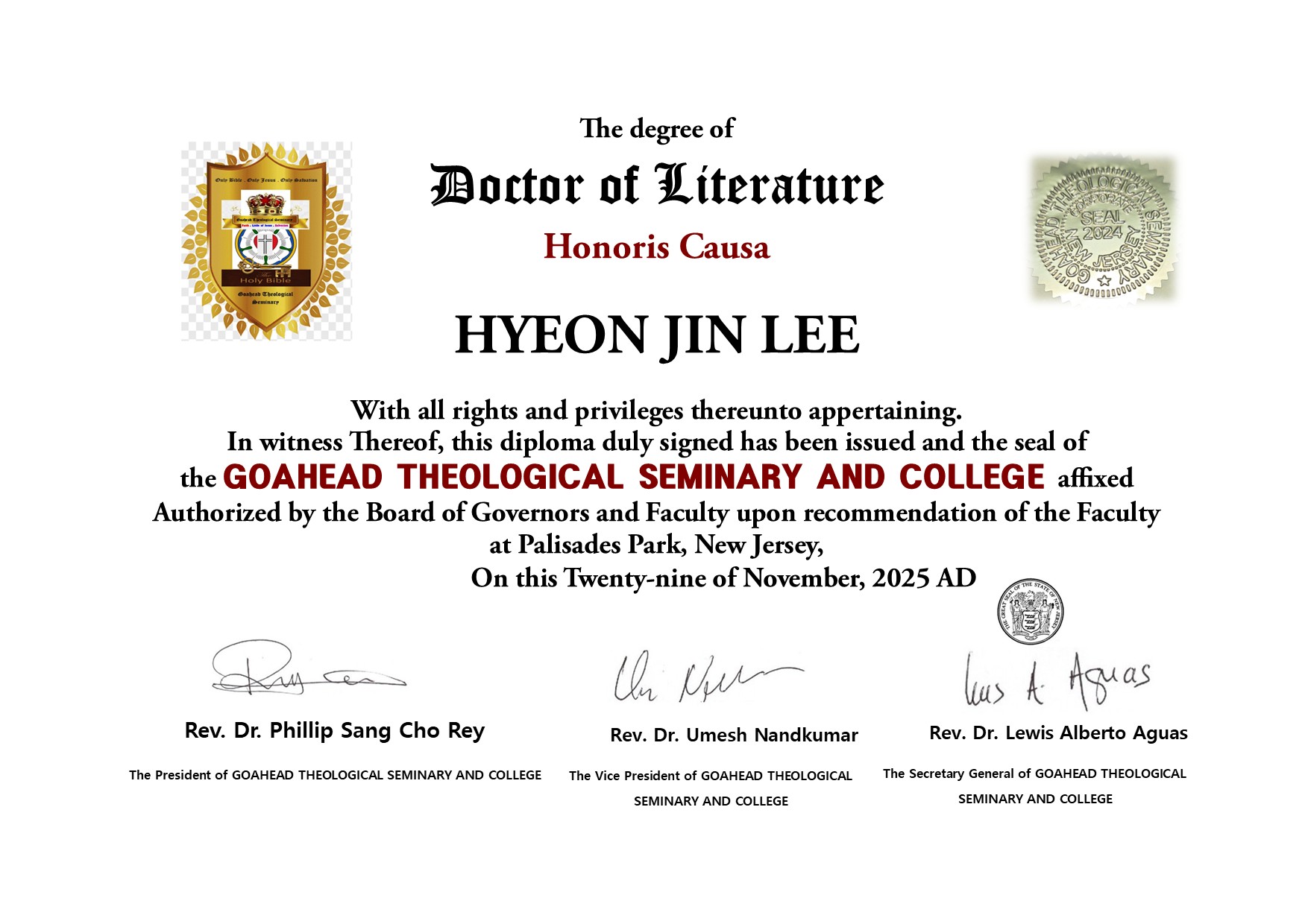 Conferment Ceremony in Han Nam University on November 29, 2025 Dr.Soung Ok Park : Doctor of Theology for Honoris Causa Dr.Hyeon Jin Lee : Doctor of Literature for Honoris Causa Dr.Young Jin Kim : Doctor of Philasophy for Honoris Causa Dr.Tae Hun Lee : Doctor of Humanities for Honoris Causa
