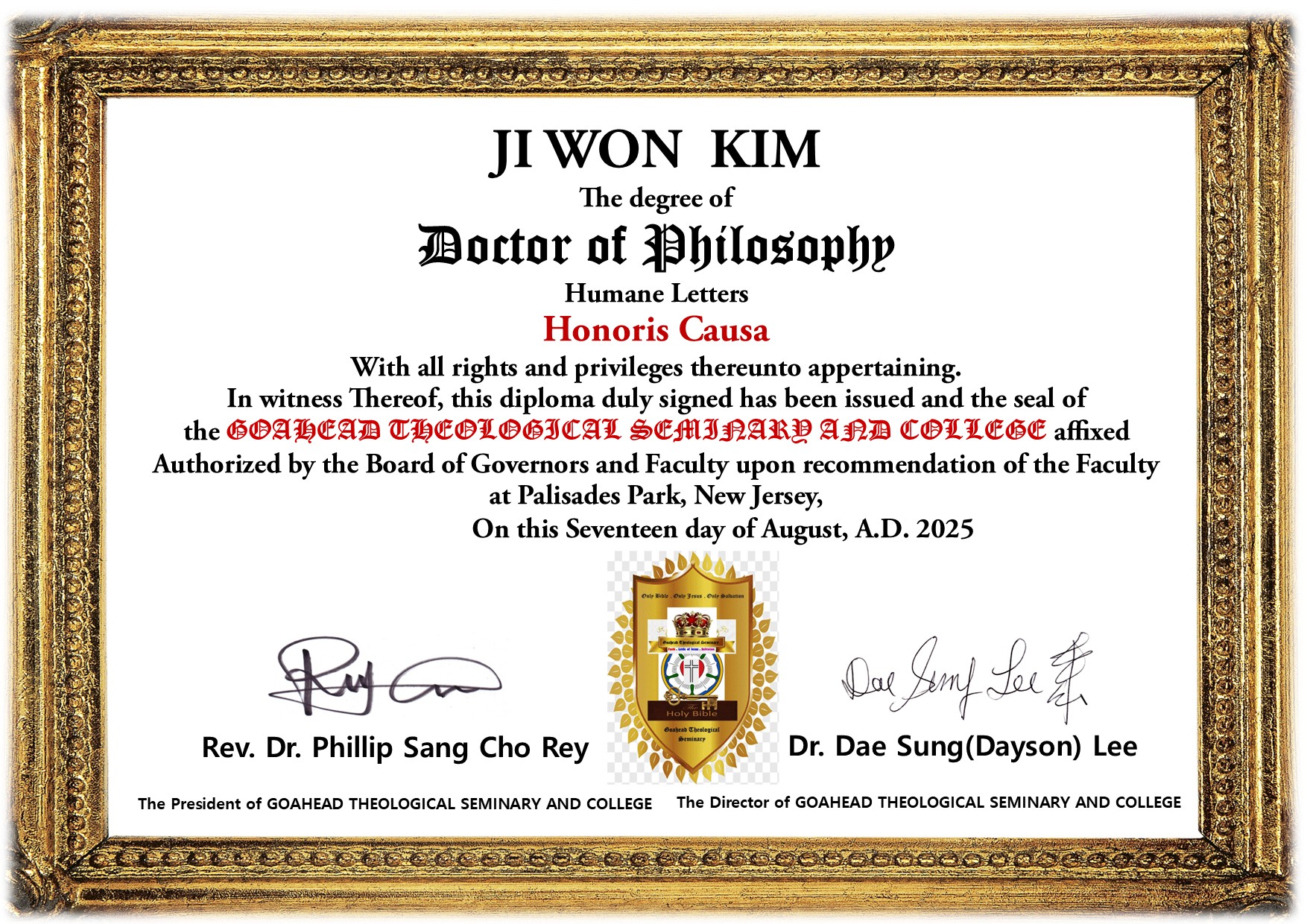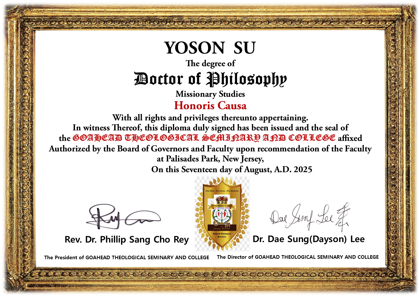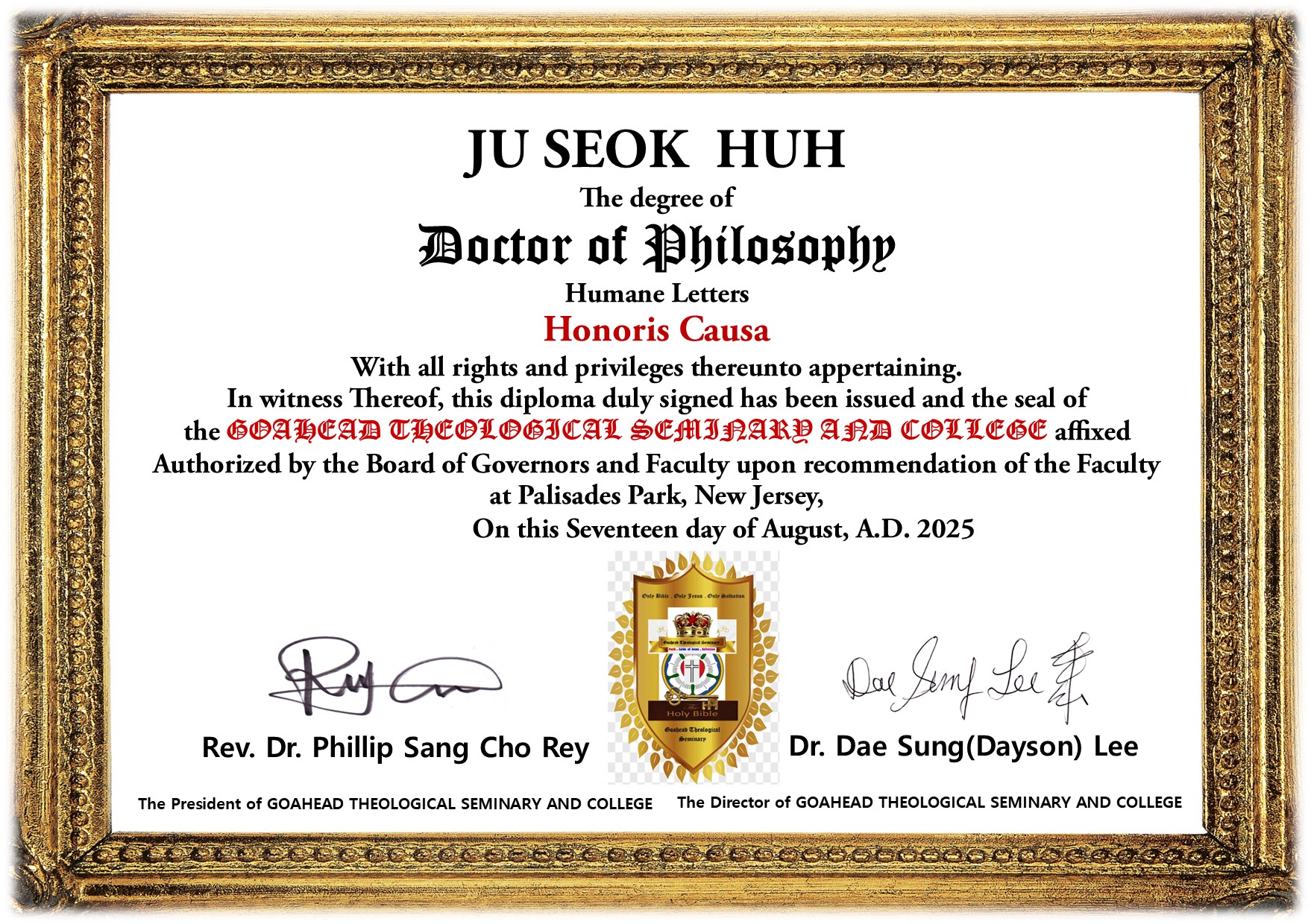 | Conferment Ceremony on August 17, 2025 Dr. Yo Son Su : Doctor of Philosophy for Missionary Studies Honoris Causa Dr. Hu Dong Kim : Doctor of Philosophy for Huname Letters Honoris Causa Dr. Jongog Back : Doctor of Philosophy for Huname Letters Honoris Causa Dr. Ju Seok Huh : Doctor of Philosophy for Huname Letters Honoris Causa Dr. Ji Won Kim : Doctor of Philosophy for Huname Letters Honoris Causa Dr. Chang Jae Woo : Doctor of Philosophy for Huname Letters Honoris Causa |