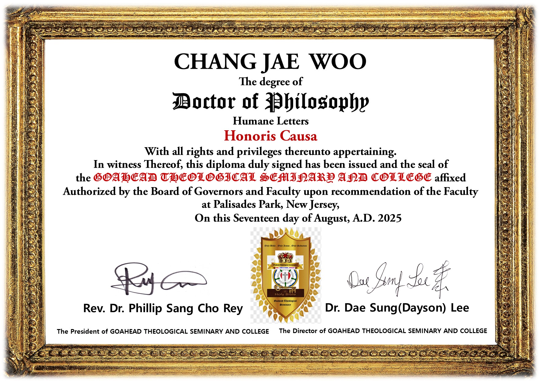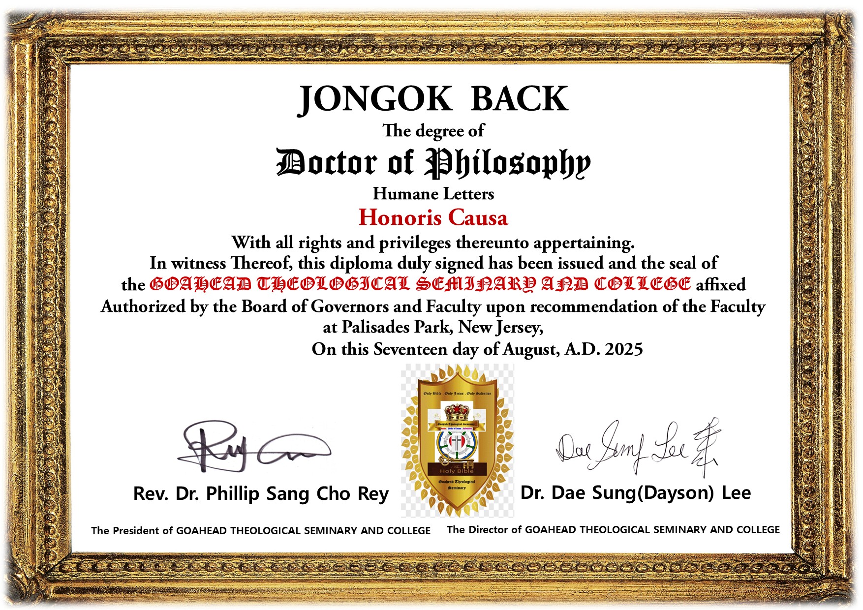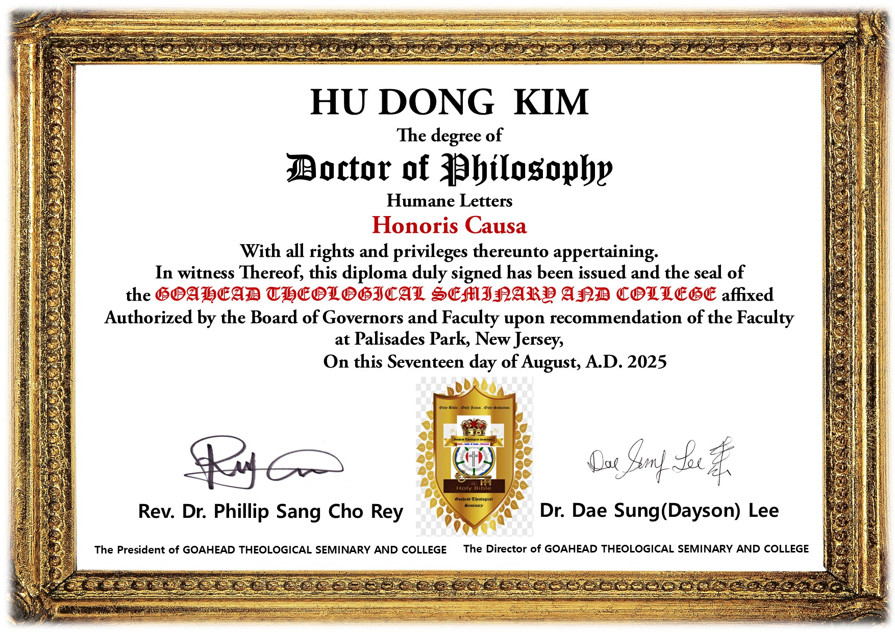 | Conferment Ceremony on August 17, 2025 Dr. Yo Son Su : Doctor of Philosophy for Missionary Studies Honoris Causa Dr. Hu Dong Kim : Doctor of Philosophy for Huname Letters Honoris Causa Dr. Jongog Back : Doctor of Philosophy for Huname Letters Honoris Causa Dr. Ju Seok Huh : Doctor of Philosophy for Huname Letters Honoris Causa Dr. Ji Won Kim : Doctor of Philosophy for Huname Letters Honoris Causa Dr. Chang Jae Woo : Doctor of Philosophy for Huname Letters Honoris Causa |